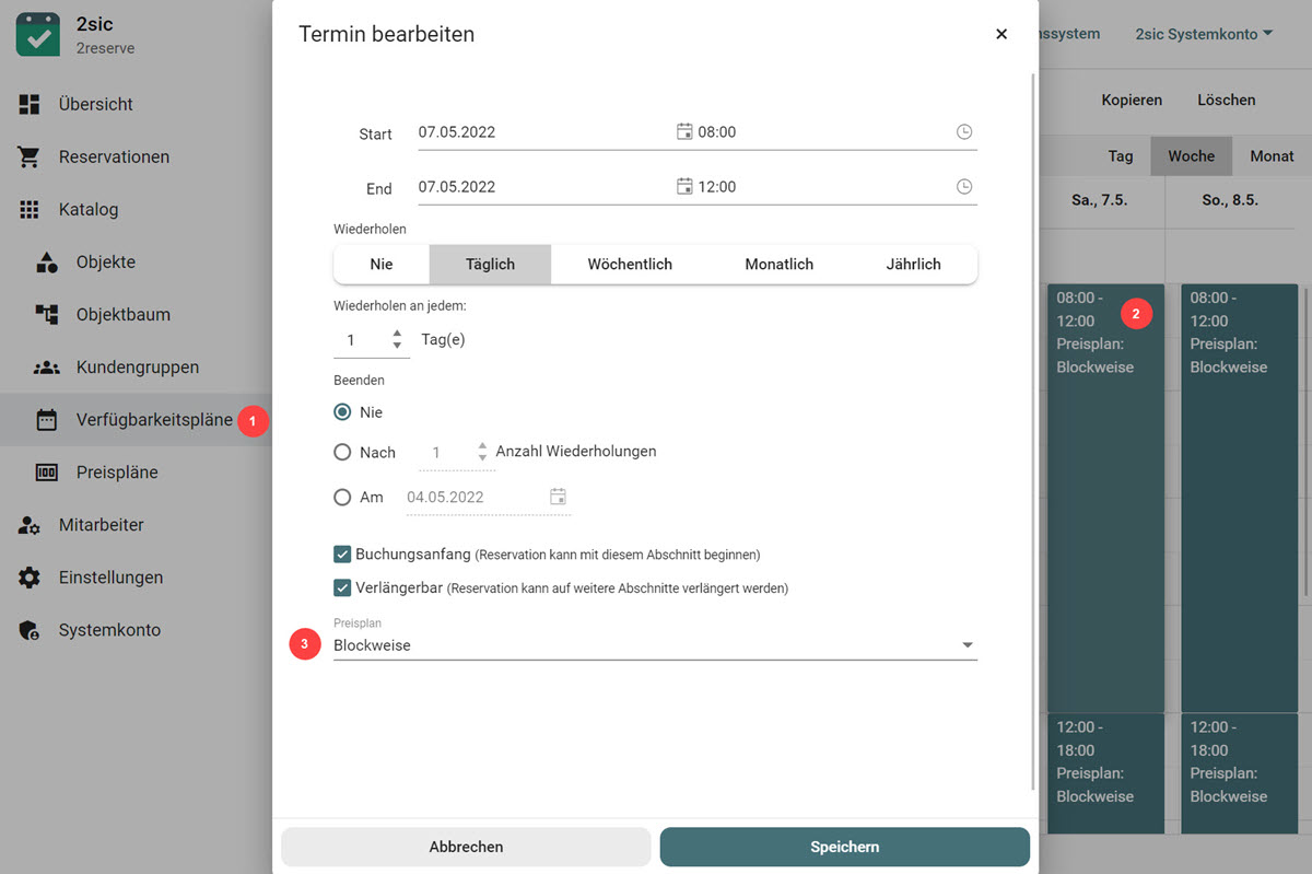 Die Einrichtung von zeitlichen Intervallen ist zum Beispiel bei Berghütten oder Ferienzimmern sinnvoll. Diese sollen nur tageweise oder für ein ganzes Wochenende gebucht werden. Auch kannst du das System so einrichten, dass Schulzimmer nur an Nachmittagen oder Abenden reserviert werden.